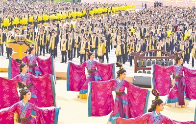 当日上午,黄帝故里园区旗幡猎猎、庄严肃穆。南门广场上,龙腾虎跃,鼓声震天。寓意着中华儿女来自五湖四海的540名炎黄子孙,分别组成各90人的文化方阵、岐黄方阵、企业方阵、同拜方阵、台胞方阵、侨胞方阵六大拜祖队伍,整肃衣冠,佩戴黄帝丝巾,进寻根门、经系祖坛、上轩辕桥、过故里祠,观甲骨碑林方柱高举,感杜岭方鼎王者风范,听青铜编钟古音缭绕,最后缓步来到拜祖广场,端详两侧连廊浮雕,感触中华文明五千多年的源远流长。